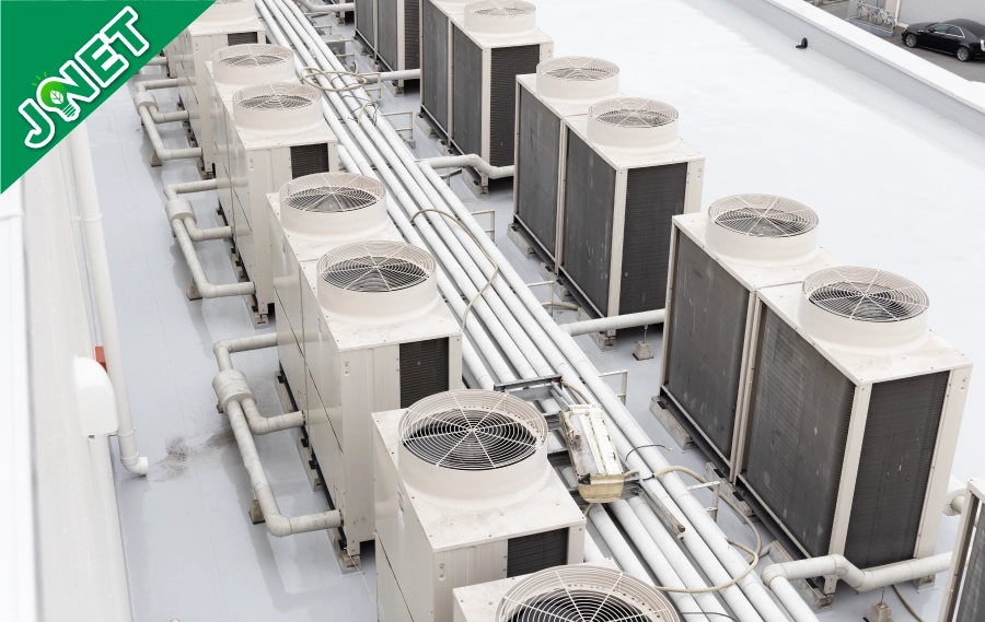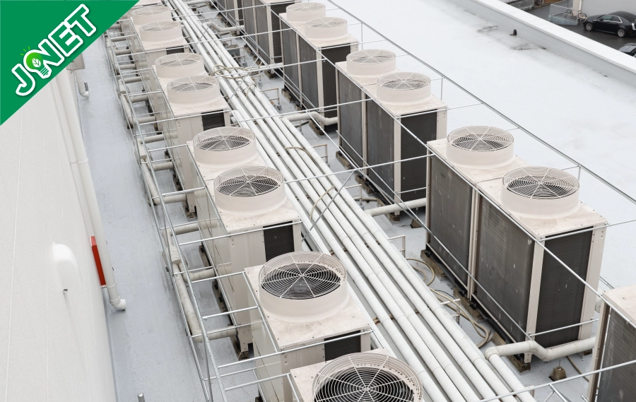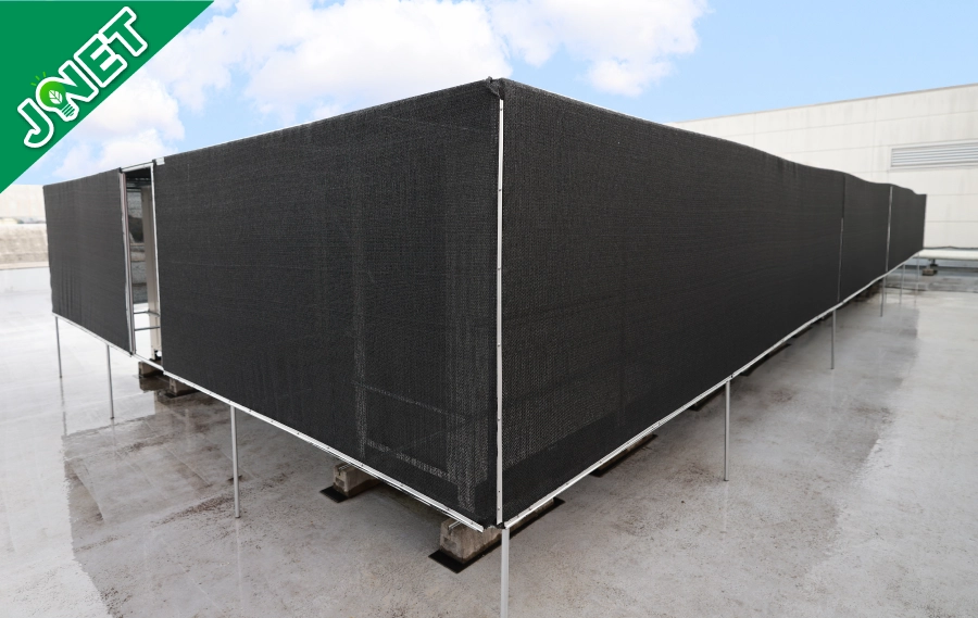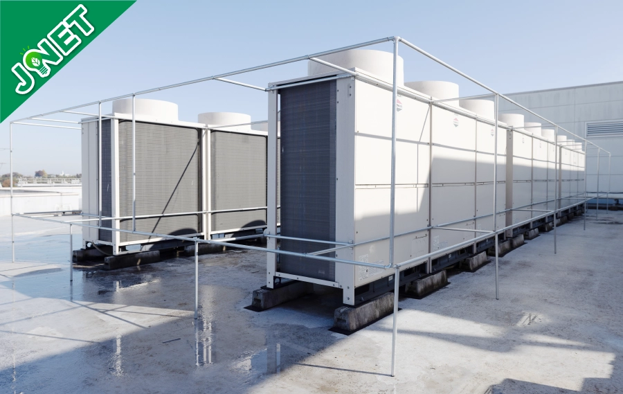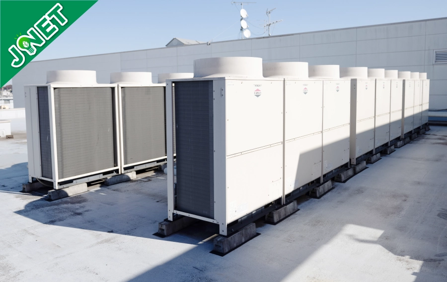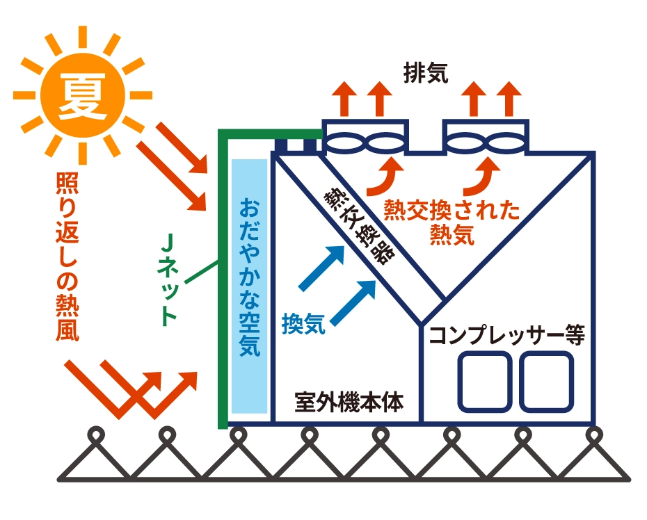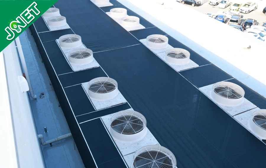 弊社がご提案する「JNET」は、空調の室外機や屋根に特殊なネットをかぶせ、直射日光・紫外線をカットすることで、空調の消費電力を大幅に抑え、お客さまに大変ご好評をいただいております。詳しくはお気軽にお問い合わせ下さい。
